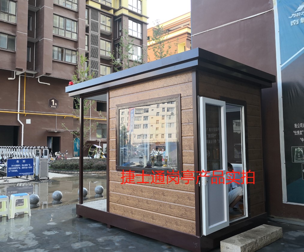 此款為仿木紋崗?fù)?帶站臺(tái)保安亭 ,常規(guī)尺寸:1.5*2.0 、2.0*2.5、2.0*3.0 (其他可定制),