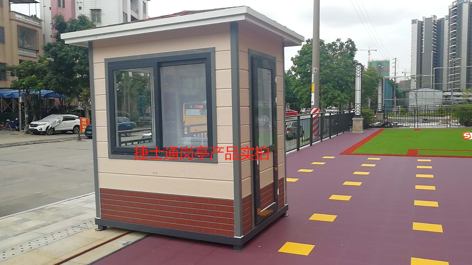 此款實拍案例位于廣州市南沙區(qū)南沙街東瓜宇金灣幼兒園 ,定制的金屬雕花板保安崗亭,