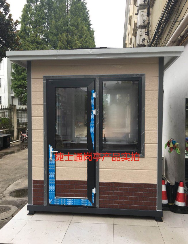 此款為實(shí)拍保安崗?fù)?,位于上海市奉賢區(qū) ,常規(guī)尺寸為:1.5 ×2.0 、2.0 ×2.0 、2.0 ×3.0,除限寬3米,其他尺寸捷士通都是可以定制的,不論冬季還是炎炎夏日,捷士通定制的崗?fù)ざ季哂斜馗魺幔臎龅男Ч?,給執(zhí)勤者提供舒適的工作環(huán)境。主要特點(diǎn):保安亭整個(gè)高度比常規(guī)崗?fù)ひ吆芏?、頂部采用雙層頂,既起到美觀的作用、還能讓空調(diào)外機(jī)安裝在頂部、很是實(shí)用、讓美觀和實(shí)用相結(jié)合。