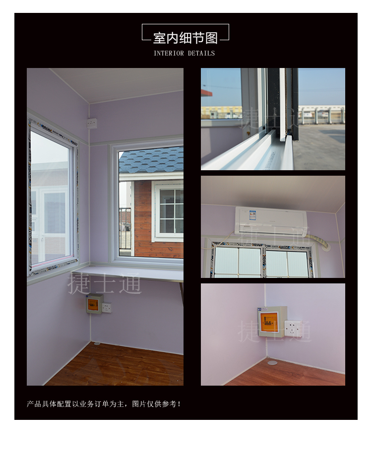 其他標(biāo)準(zhǔn)配置:墻體含保溫材料,屋頂鍍鋅板靜電噴涂,PVC吊頂,地板可定做防滑鋁板,電箱、開關(guān)、插座、暗敷電線、照明燈、桌面、抽屜、鍵盤托、空調(diào)架等