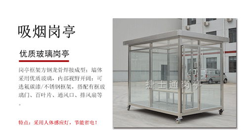 捷士通吸煙崗?fù)ぎa(chǎn)品主體結(jié)構(gòu)為方鋼龍骨焊接,按標(biāo)準(zhǔn)焊接,保證整體結(jié)構(gòu)穩(wěn)固,崗?fù)ぶ黧w墻體為玻璃材質(zhì),可以根據(jù)需要