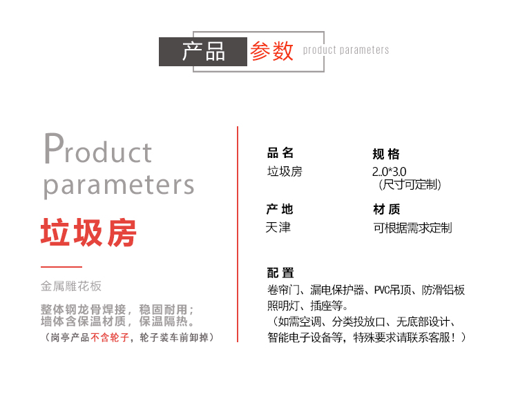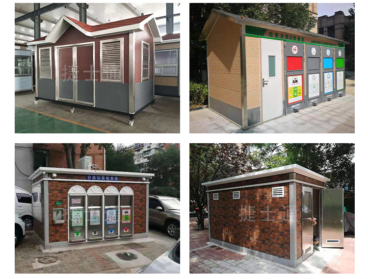 包括垃圾房的門都可以有很多種模式,例如卷簾門、腳踏式、平開式及推拉式等等。如這些垃圾房選的就是金屬雕花板的外墻體,它的內(nèi)部有一層錫箔紙,別小瞧這一層薄薄的錫箔紙,它可是起到了耐腐蝕的作用,畢竟各類垃圾混合在一起而產(chǎn)生的腐蝕性溶液也是較強(qiáng)的。各種配置的都有,最近很熱門的垃圾分類房(帶垃圾箱那種),我們都可以制作,里面如果你還要燈、排風(fēng)扇、電源我們都會給您配置,包括你想在垃圾房里及工作室內(nèi)安裝一個空調(diào),我們都可以做到。